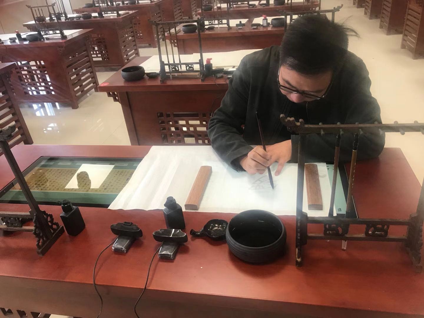 (张甲楠书记亲自测试毛笔字实训室图)